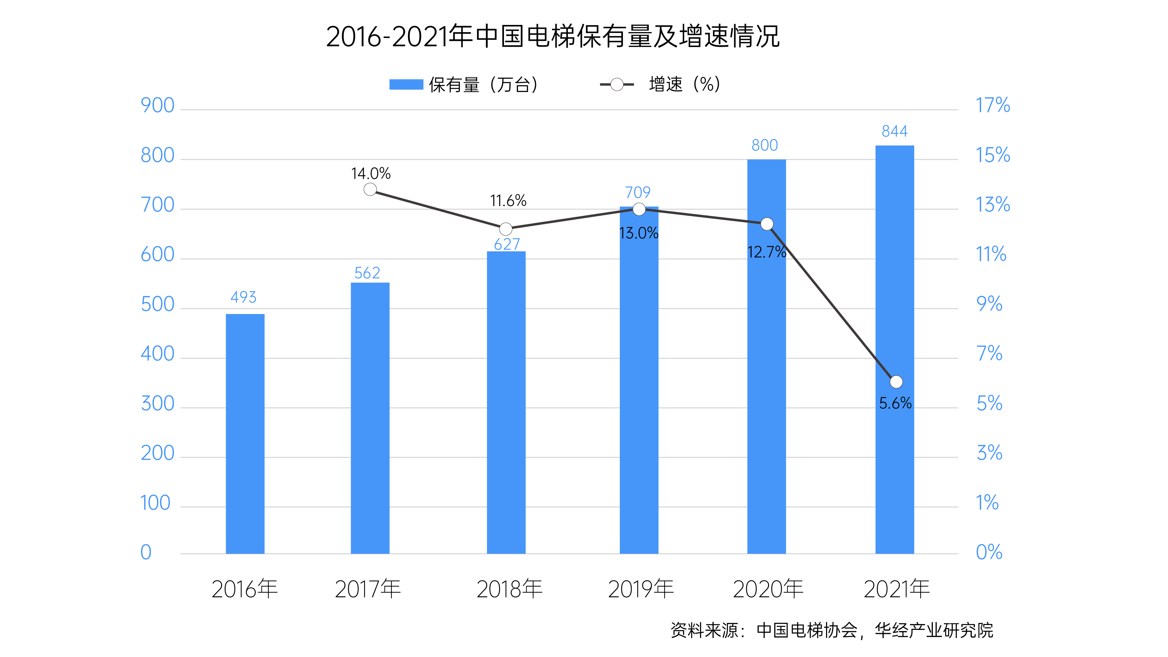 資料顯示,2021年我國電梯保有量為844萬臺,同比增長5.6%。在人口基數較大,人均電梯使用保有率提升,以及人口老齡化加重,老舊小區(qū)持續(xù)推進電梯新裝等背景下,我國電梯行業(yè)也迎來了增長的重要契機。